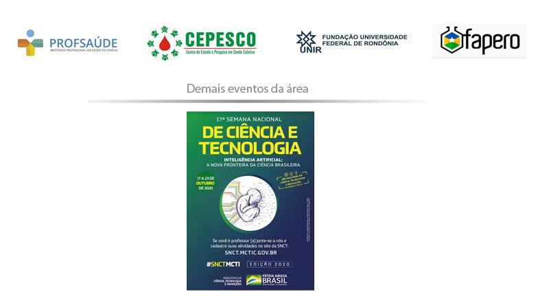 O II Encontro de Saúde Coletiva é uma realização do Mestrado Profissional em Saúde da Família – ProfSaúde/UNIR, em articulação com a Residência Multiprofissional em Saúde da Família – Remusf/UNIR e grupo Pet Saúde Interprofissionalidade Promoção da Saúde e Segurança do Paciente, com o apoio do Centro de Estudo e Pesquisa em Saúde CEPESCO, Núcleo de Saúde e departamentos acadêmicos de Enfermagem, Educação Física, Medicina e Psicologia da Fundação Universidade Federal deRondônia/UNIR.