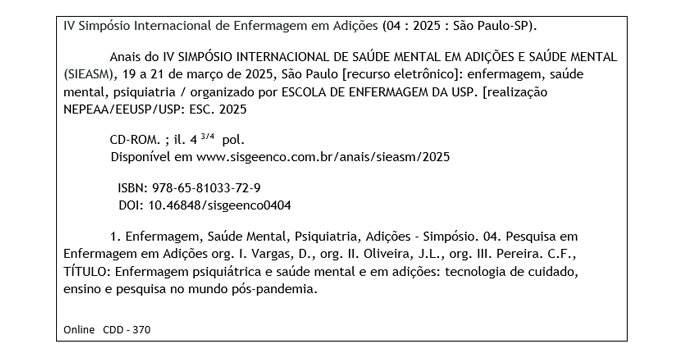Como citar: SOBRENOME, Nome do autor do artigo. Título do artigo. In: Anais do IV SIMPÓSIO INTERNACIONAL DE ENFERMAGEM EM ADIÇÕES E SAÚDE MENTAL (SIEASM). Anais...São Paulo(SP) Online, 2024. Disponível em: www.sisgeenco.com.br/anais/sieasm/2025. Acesso em: dia, mês e ano.