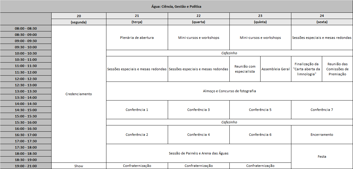 Essa vigésima edição do CONGRESSO BRASILEIRO DE LIMNOLOGIA tem como objetivo reunir estudantes e pesquisadores, empresas e membros da sociedade civil em torno de assuntos, temáticas e discussões relacionadas a água e seus diversos usos e conflitos.